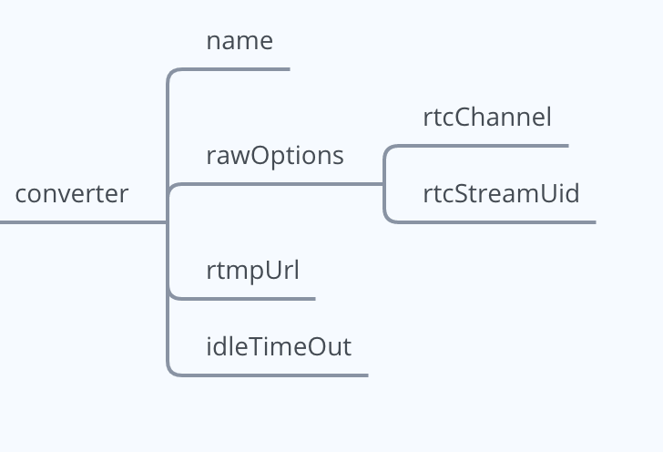 不转码推流的请求包体为 JSON Object 类型的 converter 字段,字段结构如图所示:
