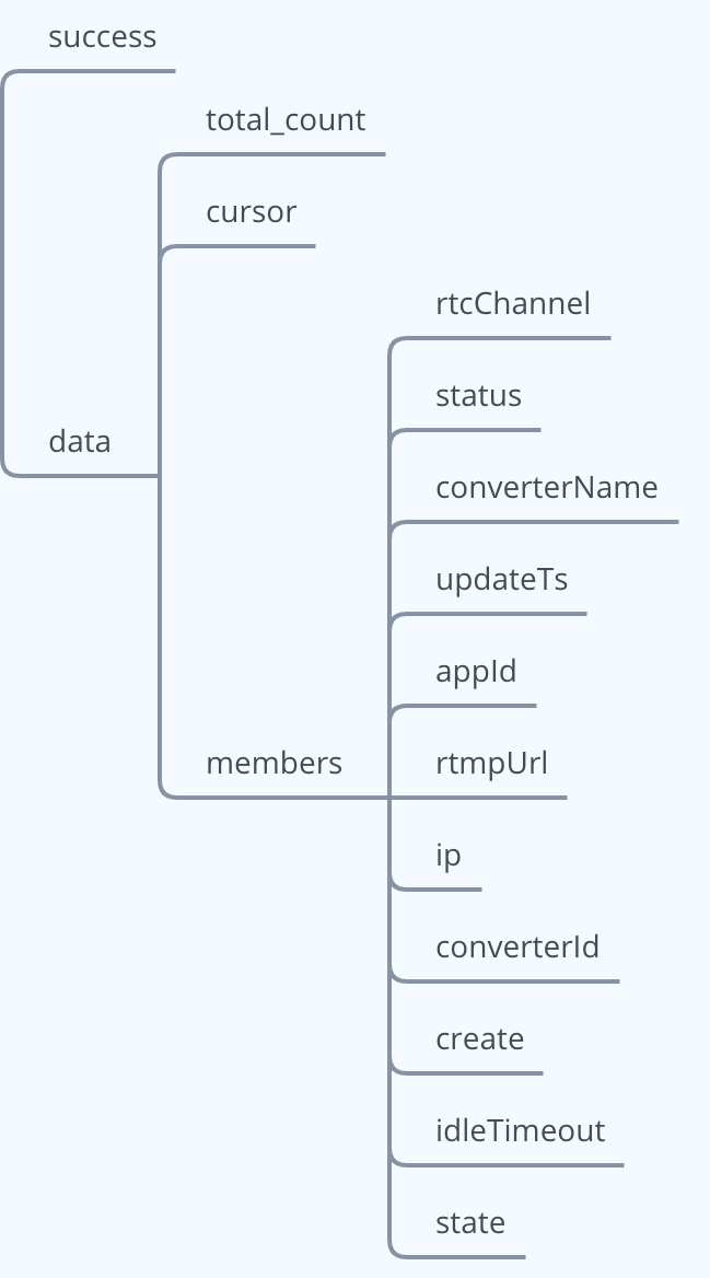 | fields | String | JSON 编码方式的字段掩码,详见谷歌 protobuf FieldMask 文档。用于描述返回的 converter 中包含的字段集合。在本示例中,fields 指定了声网服务器返回 converter 字段中的 id,createTs,updateTs 和 state 字段子集。 |