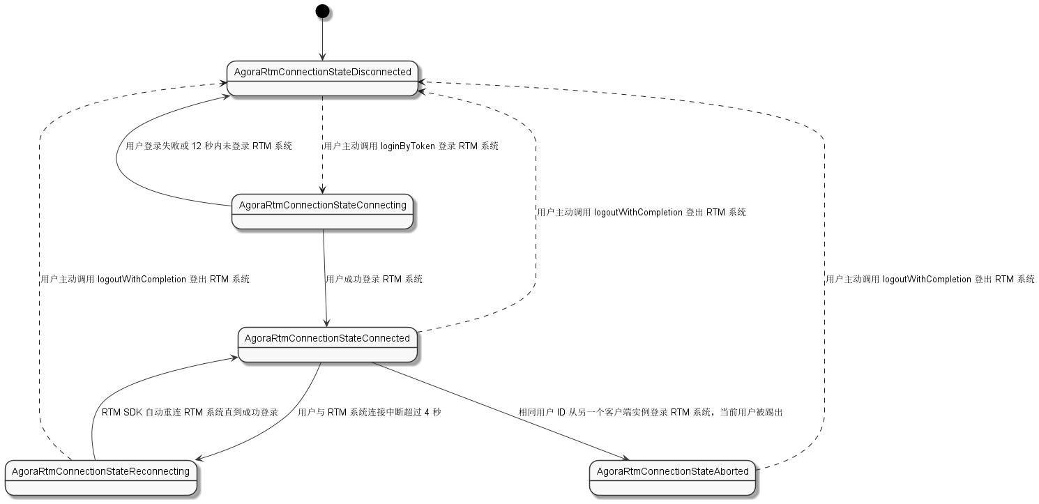 在你调用 loginByToken 登录 RTM 系统时,连接状态会从 AgoraRtmConnectionStateDisconnected 转换为 AgoraRtmConnectionStateConnecting,状态改变原因为 AgoraRtmConnectionChangeReasonLogin。处于 AgoraRtmConnectionStateConnecting 状态时,连接状态会自动转换为下列状态之一: