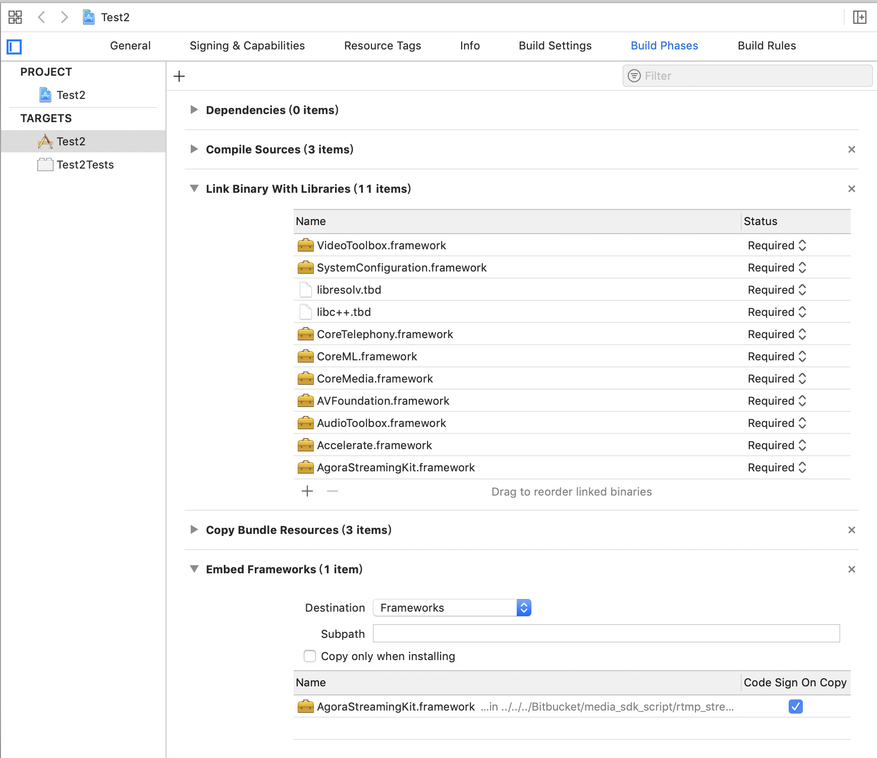 在 TARGETS > Project Name > General > Frameworks, Libraries, and Embedded Content 菜单中,将 AgoraStreamingKit.framework 的状态修改为 Embed & Sign。