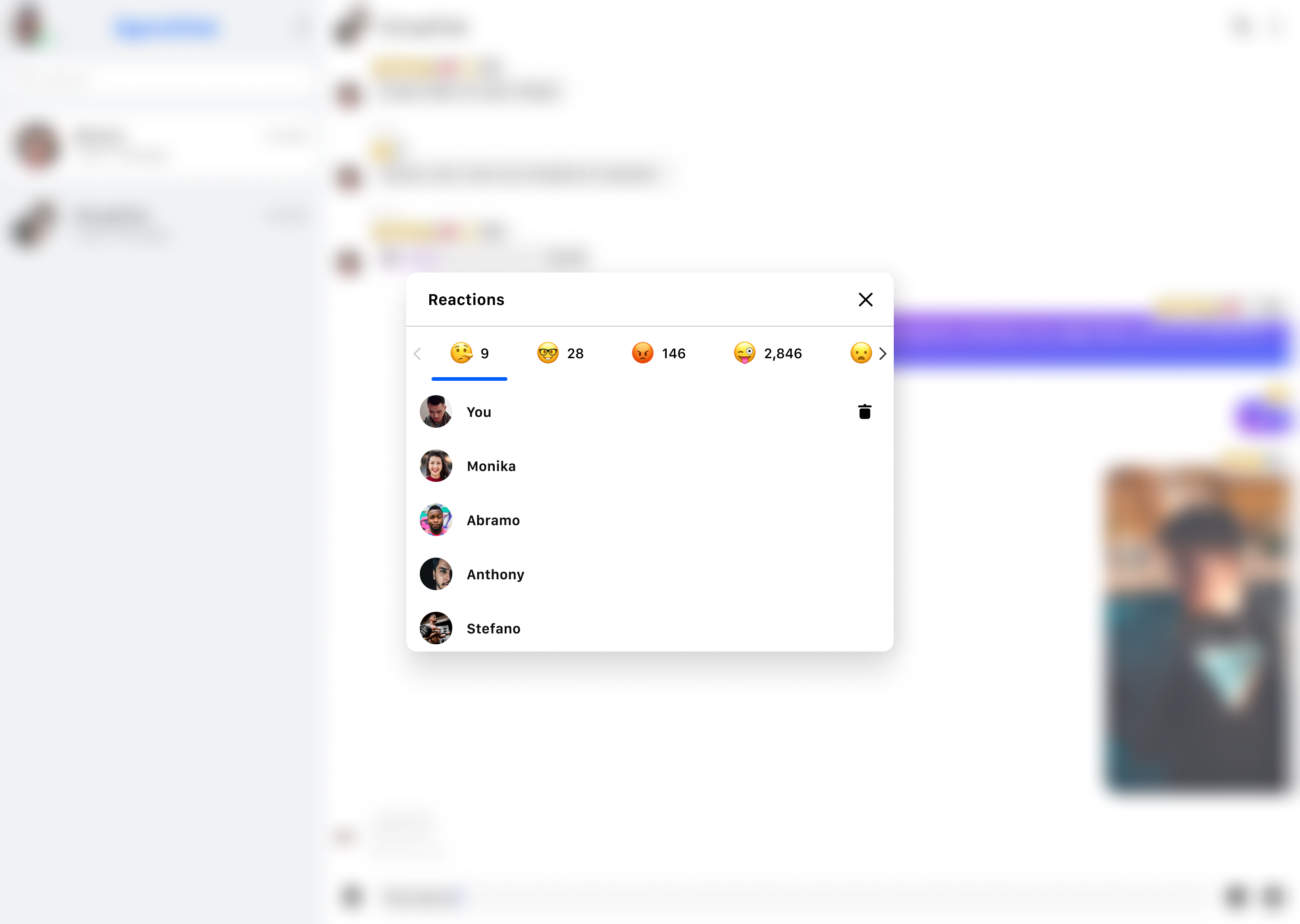 Call getReactionDetail to get the detailed information of the reaction from the server. The detailed information includes the reaction content, the number of users that added or removed the reaction, and the complete list of user IDs that added or removed the reaction.