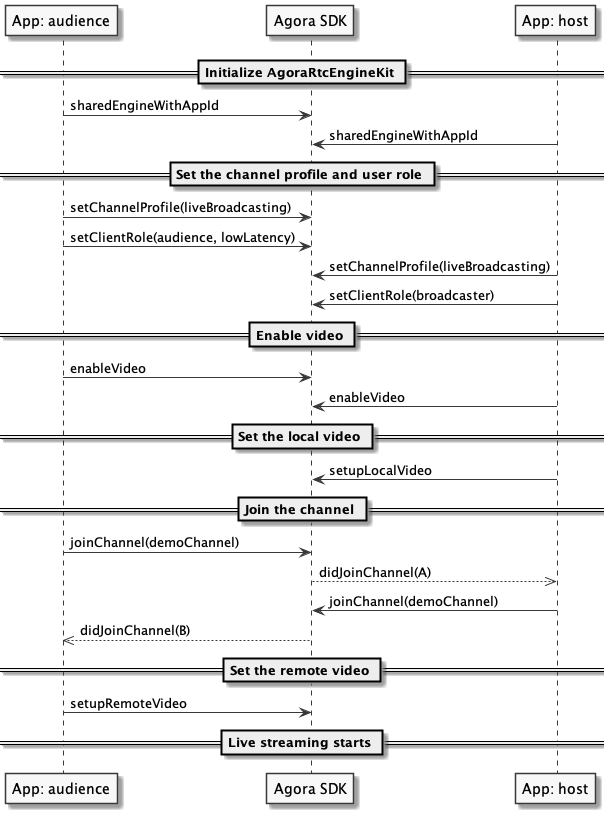 This page shows the minimum code you need to integrate high-quality, low-latency live streaming experience into your app using the Agora Video SDK for iOS.