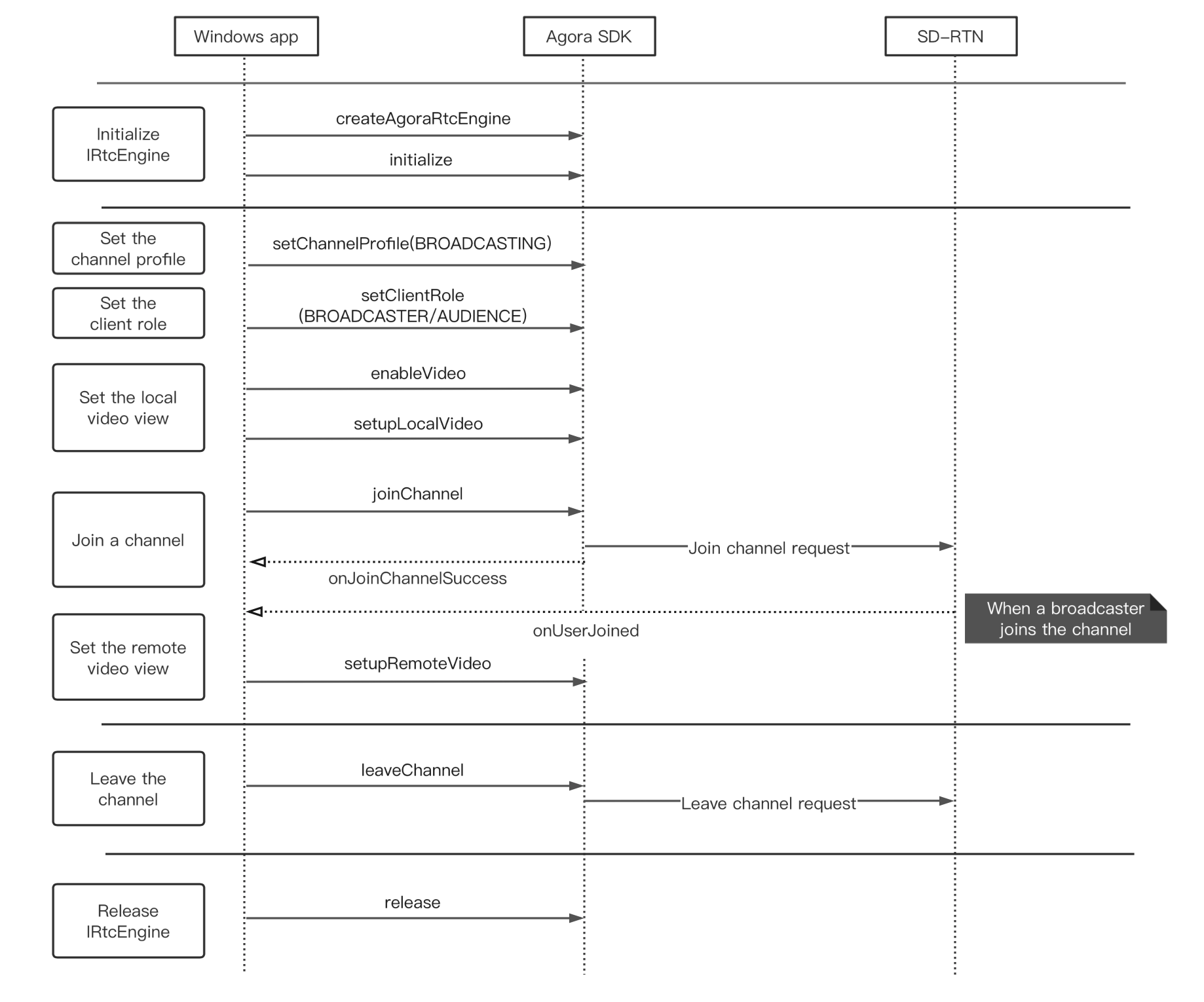 This section introduces how to use the Agora SDK to start the interactive live video streaming. The following figure shows the API call sequence of the interactive live video streaming.