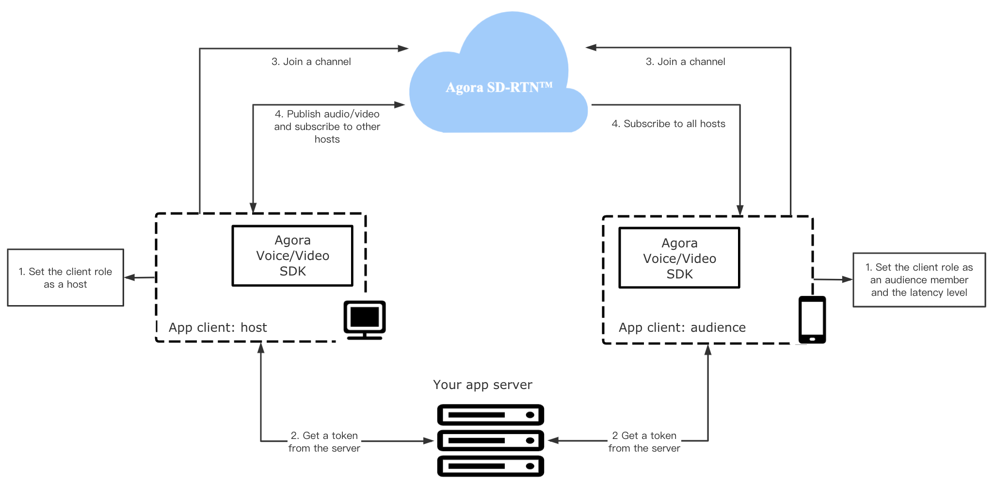 Each user in an Interactive Live Streaming Standard channel is either a host or an audience member. Hosts publish streams to the channel, and the audience subscribe to the streams. When a user is an audience member, you can control the delay the user receives host streams using ClientRoleOptions.